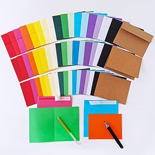 Quantity: Packages includes 108 Sets 18 Colors Blank Cards and Envelopes Stationery Set, including 108 Pcs A6 Invitation Envelopes Self Seal, 54 Pcs A6 Flat Cards and 54 Pcs A6 Folded Cards, 2 Pcs painting pens in gold and white,1 Pc mark in black and 1 sheet decorative embellishment stickers. Each color has 6 Pcs A6 Invitation Envelopes, 3 Pcs flat Cards and 3 Pcs Folded Cards.