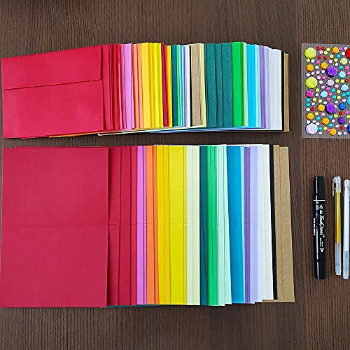 108 Sets 18 Colors A6 Invitation Envelopes Peel & Seal with A6 Folded Cards Assortment Stationery Kit: including 108 pcs 18 Colors A6 Invitation Envelopes, 108 pcs A6 Folded Cards Notecards, Each color has 6 sets A6 Invitation Envelopes and A6 Flat Cards, 2 Pcs painting pens in gold and white, 1 Pc mark in black and 1 sheet decorative embellishment stickers.