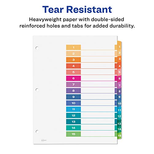 Specification: Avery 15-Tab Dividers for 3 Ring Binders, Customizable Table of Contents, Multicolor Tabs, 6 Sets (11197)