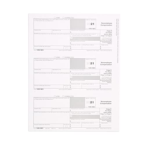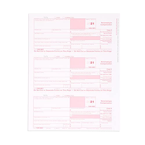 Bundle includes 17 sheets of 1099-NEC COPY A (3 forms per sheet), 17 sheets of 1099-NEC COPY B (3 forms per sheet), 34 sheets of 1099-NEC COPY C/1/2 (3 forms per sheet), 50 self-seal envelopes, 3 1096 Transmittal forms all designed to be QuickBooks compatible, plus a CD-ROM for 2021 TaxRight Software (previously called TFP). TAXRIGHT IS ONLY COMPATIBLE WITH WINDOWS 10 OR HIGHER.