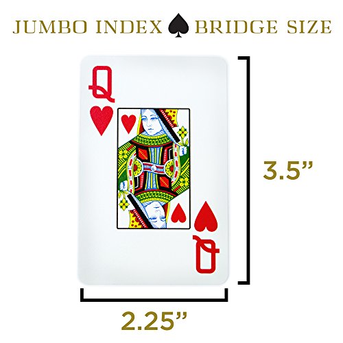 ♦️ CARD TYPE: This product includes two decks of 52 cards, 2 jokers and a guarantee card. The decks are bridge sized which measure 3 1/2” by 2 1/4 “. This is considered a “narrow” size. The letter size is jumbo index which is the large size compared to our regular index cards. Each letter and symbol measure about 1/2” in length.