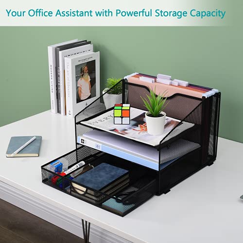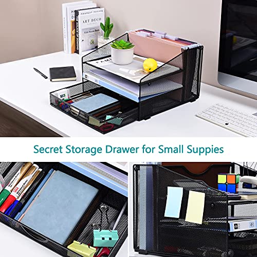 desk organizer and office supplies—【POWERFUL STORAGE CAPACITY】— the mesh office supplies organization has 4 compartments and 1 sliding drawer can accommodate various things on the desktop (A4 paper, notebooks, folders, books, magazines and other office supplies). Make your desktop more tidy and provide you with a convenient and comfortable office environment.