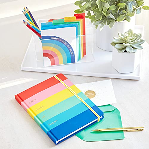 Cheery hardcover journal features a rainbow striped cover with gold foil “Every shade of happy” lettering.