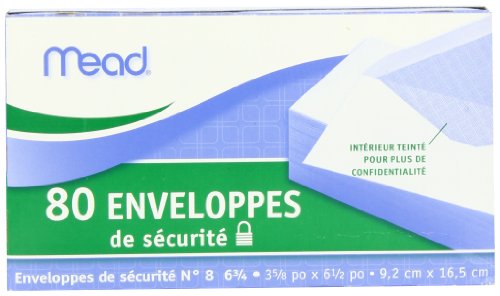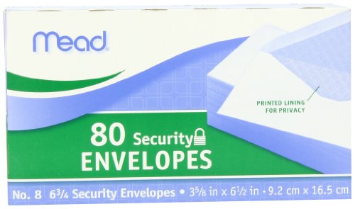 Mead 6-3/4 Security Envelopes. Keep sensitive information confidential. Keep prying eyes off of your important documents with this number 6-3/4 security envelope. It has a printed lining for privacy, so it”s ideal for sending confidential mail, and the V-flap is fully gummed for a secure seal. Each envelope is constructed from 20-lb. bond paper. The 6-3/4-inch style and size is best for checks and brief notes.