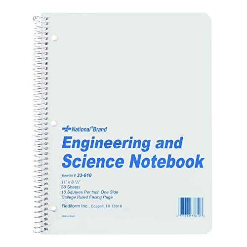 National Engineering and Science Notebook with durable, rigid gray cover and wire binding. Featuring 60 sheets of white paper with 10 x 10 quad ruling on the left side and college ruling with margin on the facing pages. The National Engineering and Science Notebook is made with a minimum of 50% post-consumer recycled material.