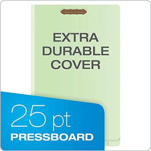 Pendaflex Pressboard End-Tab Classification Folders help you get more out of your open-shelf filing system. Sturdy 25-pt. pressboard covers and one 17-pt. kraft divider provide 4 total fastener surfaces. A tear-resistant Tyvek color-matched spine expands 2.5″ to hold up to 400 sheets. A full-length tab provides plenty of room for handwriting or labels. Covers made from 60% recycled fiber with at least 30% post-consumer fiber; dividers made from 10% recycled fiber with at least 10% post-consumer fiber. Legal size, light green. 10 Per box.