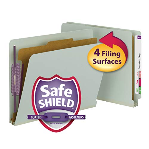 Specification: Smead 100% Recycled End Tab Pressboard Classification File Folder with SafeSHIELD Fasteners, 1 Divider, 2″ Expansion, Letter Size, Gray/Green, 10 per Box (26800)