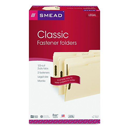 Smead Fastener File Folder, 2 Fasteners, Reinforced 1/3- Cut Tab, Legal Size, Manila, 50 Per Box (19537)