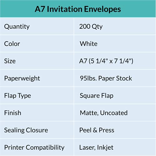 Quantity: Package includes 150 Pcs A7 Invitation envelopes in White Peel & Seal Self Seal. According to our in house print tests and customer feedback, our envelopes and cards can printed by laser printers and inkjet printers friendly.