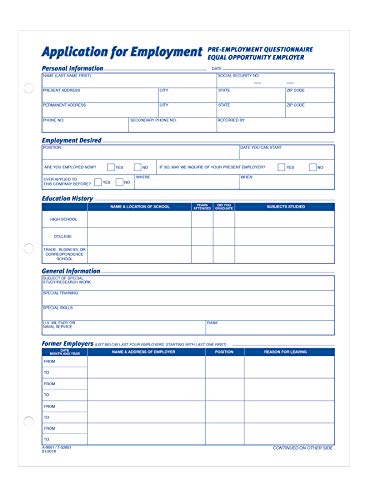 Employment application forms are revised for acceptance in all states and offer complete information request in a well-organized format. Two-sided comprehensive form protects an employer and employee from discriminating practices by providing a thorough system of critical questions. Each form contains appropriate warnings and wording throughout. Each pad contains 50 sheets of 18 lb. white bond. Gum padding at top means no loose sheets to keep together.